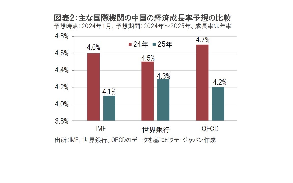 主な国際機関による中国の24年の経済成長率予想を見ると、国際通貨基金(IMF)が4.6%、世界銀行は4.5%、経済協力開発機構(OECD)は4.7%です(図表2参照)。24年の予想数字だけを見ると、「5%前後」は予想の許容範囲内とも見られます。しかし、各機関とも25年の成長率は24年を下回ると見込んでいます。成長率の伸びが鈍化すると見込まれているのは、中国経済の先行きに課題が残されていることを示唆しています。