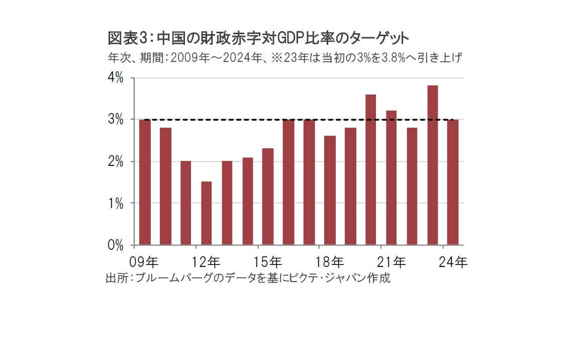 中国の景気テコ入れ策は財政政策主導になると見られます。財政政策の規模の目安である財政赤字対GDP(国内総生産)比率は3%に設定され中国の景気テコ入れ策は財政政策主導になると見られます。財政政策の規模の目安である財政赤字対GDP(国内総生産)比率は3%に設定されました(図表3参照)。もっとも、23年10月に常務委員会は同比率(目標)を3.8%へ引き上げることを承認し、新規国債の発行枠を1兆元(約21兆円)増やしました。24年の財政運営でも必要に応じ柔軟に規模を拡大するのかが注目されます。