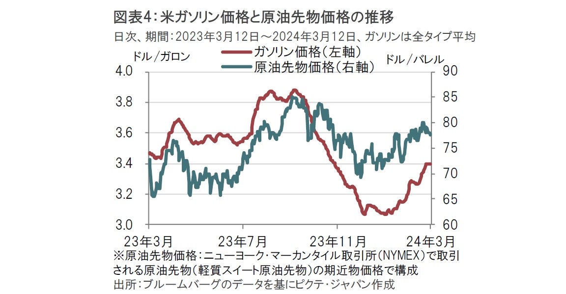 図表2にあるように、2月のサービス価格の低下分の多くはエネルギー価格の上昇が埋め合わせました。エネルギー価格指数の構成割合で半分程度を占めるガソリン価格の上昇が、エネルギー価格を押し上げた主な背景と見ています。エネルギー価格指数は2月に前月比2.3%上昇する中、ガソリン価格指数は3.8%も上昇していたからです。全米自動車協会が提供するガソリン価格(全タイプ)データを図表4で見ると、原油価格の上昇に伴い、年末年初の水準から切り上がっています。ただし、原油先物価格は24年になり80ドル/バレルを天井に伸び悩む展開となっています。ガソリン価格(全タイプ)にも、足元でやや伸び悩みの兆しが見られます。