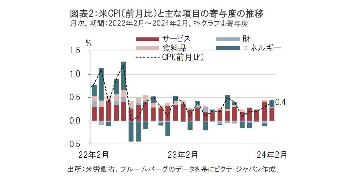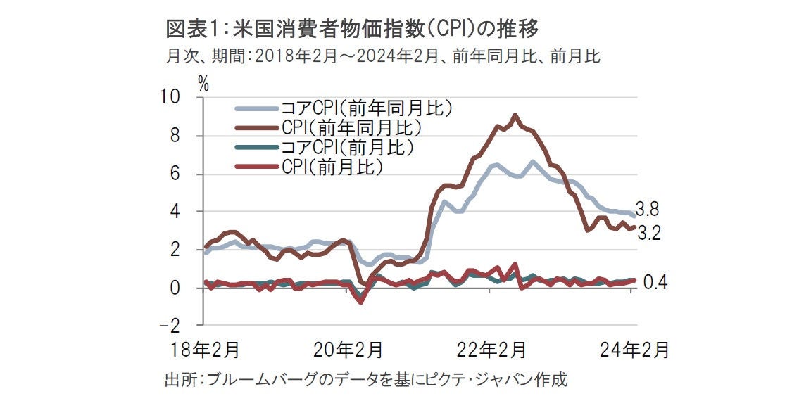 米労働省が3月12日に公表した2月の米消費者物価指数(CPI)は前年同月比で3.2%上昇と、市場予想、前月(共に3.1%)を上回りました(図表1参照)。23年6月の3.0%から概ね横ばい圏の状況が半年以上続いています。前月比は0.4%上昇と、市場予想と一致し、1月の0.3%上昇を上回りました。
