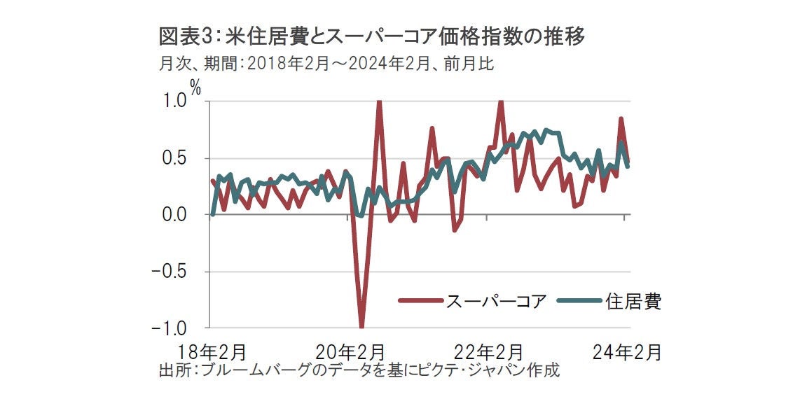 2月の米CPIで注目されたサービス価格をサービス価格から住宅関連を除いた指数(スーパーコア)と、住宅関連の指数(住居費)に分けて振り返ります(図表3参照)。