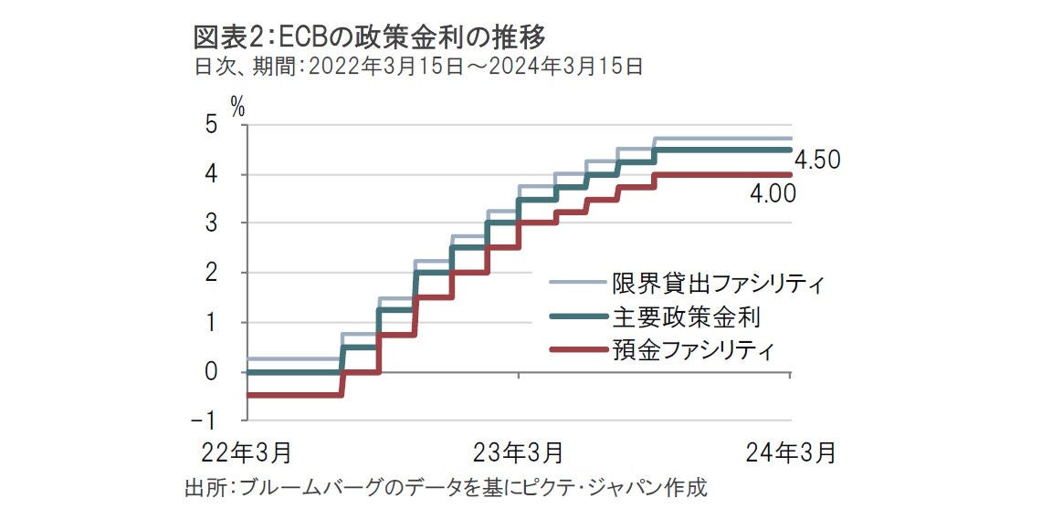 ①ECBの3つの政策金利のうち民間銀行がECBに預ける際の金利となる預金ファシリティが短期借り入れコストを変動させる主要な手段とする(図表2参照、預金ファシリティは現在も事実上の政策金利となっています)。