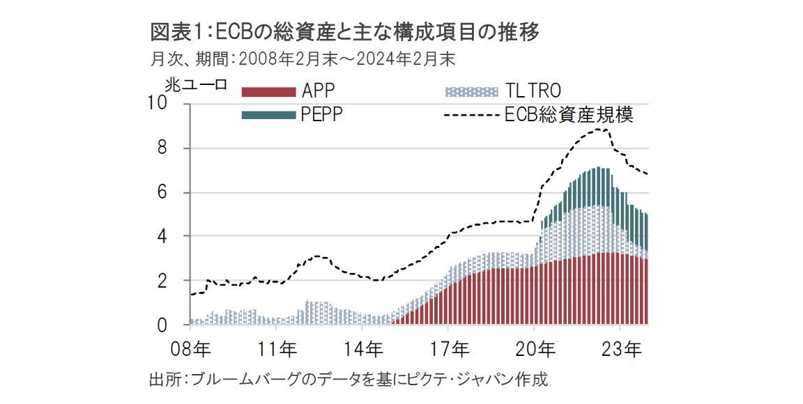 ECBは2008年の金融危機を契機に金融システムに(過剰に)資金供給する手段として長期資金供給オペ(TLTRO)を活用してきました。さらにその後資金供給手段として15年からは主に国債購入による量的緩和政策(APP)を導入しました。また、コロナ対応として20年3月に資産購入策の特別枠(PEPP)を導入しました。これらの政策は役割をほぼ終えていると見られます(図表1参照)。