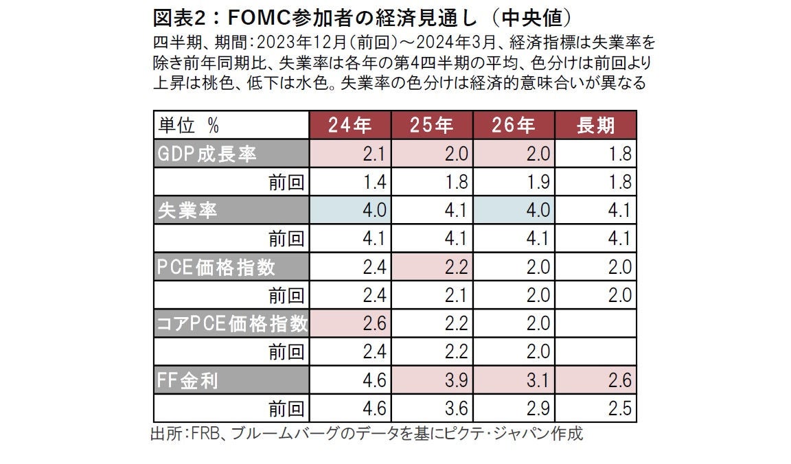 FOMC参加者の政策金利水準の見通し(ドットチャート、図表1参照)では24年利下げ見通しが3回で維持されました。市場の一部では今回のFOMCで年内の利下げが2回になるとの観測もありましたが、FOMCは3回を維持しました。