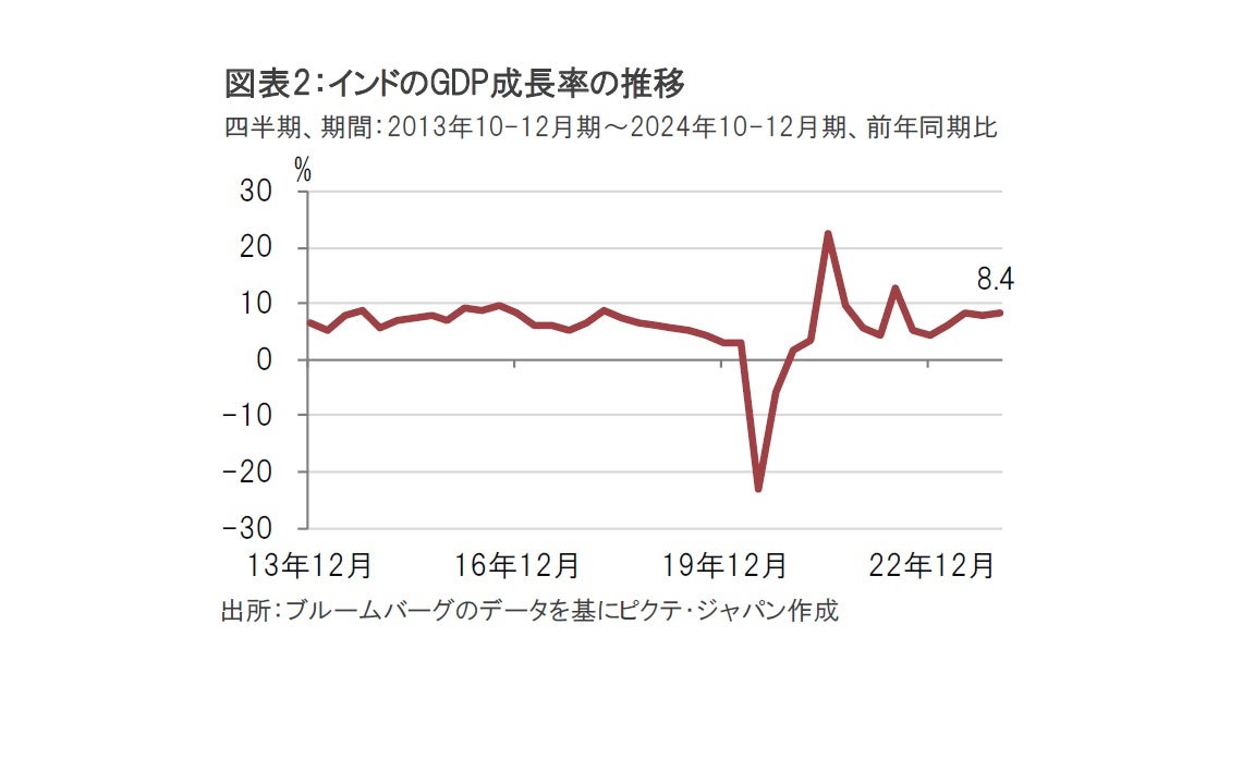 2月末に発表されたインドのGDP(国内総生産)成長率を見ると、23年10-12月期は前年同期比で8.4%増と、市場予想の6.6%増、前期の8.1%増を上回りました(図表2参照)。コロナ禍前の長期的な平均成長率を上回る水準です。