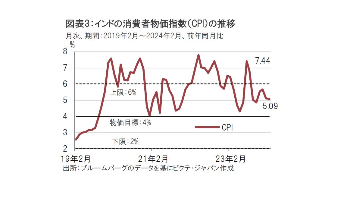 足元、インドの世論調査でモディ政権(NDA)への不満を見ると、「インフレ」が最大の懸念として指摘されているものもあります。同じ調査で経済成長や失業率の高さへの不満もあり、判断に迷う面もありますが、インフレへの懸念は幅広く共有されているようです。インドの消費者物価指数(CPI)を見ると、2月は前年同月比で5.09%と、食品価格の急騰で上昇した昨年のピークは下回っています(図表3参照)。また、インド中銀の物価目標の上限である6%は下回っている点で、現状水準は一応許容範囲です。世論調査ではどの時点のインフレ率に不満を述べているのかまでは分かりませんが、いずれにせよ物価について安心するのはまだ早いようです。まして、今回の会合の声明でインド中銀が指摘したように、(国民生活に直結する)食品価格にインフレの芽が残る中では、タカ派姿勢をすぐに崩すわけにはいかないと思われます。
