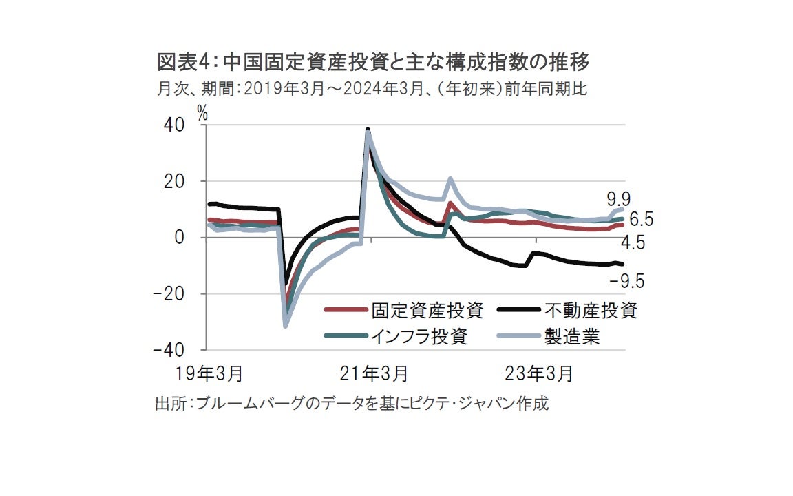 3月の主要な経済指標の中で市場予想を上回ったものの1つが固定資産投資です。固定資産投資は「不動産投資」、「インフラ投資」、「製造業」で構成されています(図表4参照)。3月のインフラ投資は年初来前年同期比で6.5%増、製造業は9.9%増と共に前月を上回り全体をけん引しました。