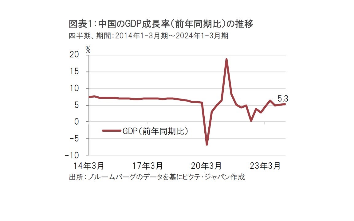 中国国家統計局が4月16日に発表した1-3月期のGDP(国内総生産)は、物価の変動を調整した実質で前年同期比5.3%増と、市場予想の4.8%増、前期の5.2%増を(図表1参照)上回りました。伸び率は政府の24年目標である「5.0%前後」を上回りました。不動産市況の低迷が続く一方で、中国政府の経済対策が成長を下支えしました。