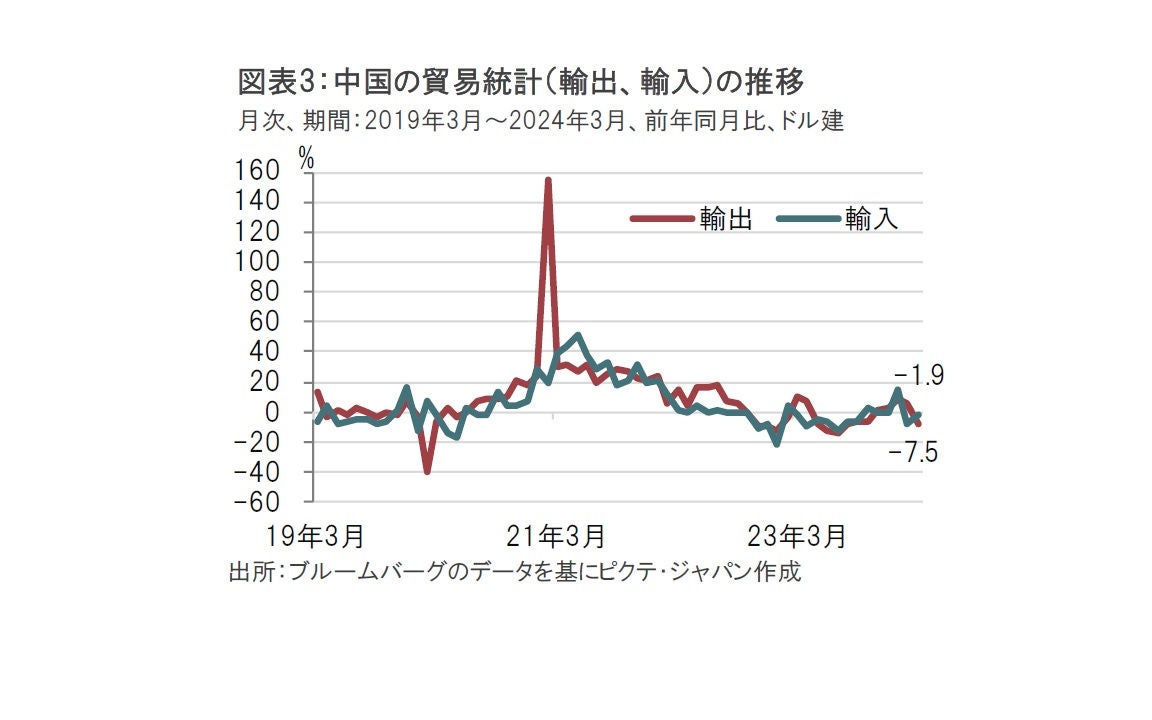 中国の外需を、12日に発表された3月の貿易統計で確認すると、輸出は前年同月比で7.5%減と、2月の5.6%増を下回りました(図表3参照)。3月の輸出が鈍化したのも昨年3月の輸出の水準が高かったことによる反動の面はありそうです。足元まで外需は比較的堅調で、輸出は先月まで前年同月比でプラスの伸びを確保していました。