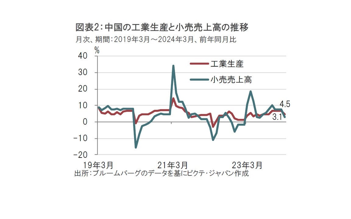 同時に発表された3月の小売売上高は前年同月比で3.1%増と、市場予想の4.8%増を下回りました(図表2参照)。3月の工業生産も前年同月比で4.5%増と、市場予想の6.0%増を下回りました。