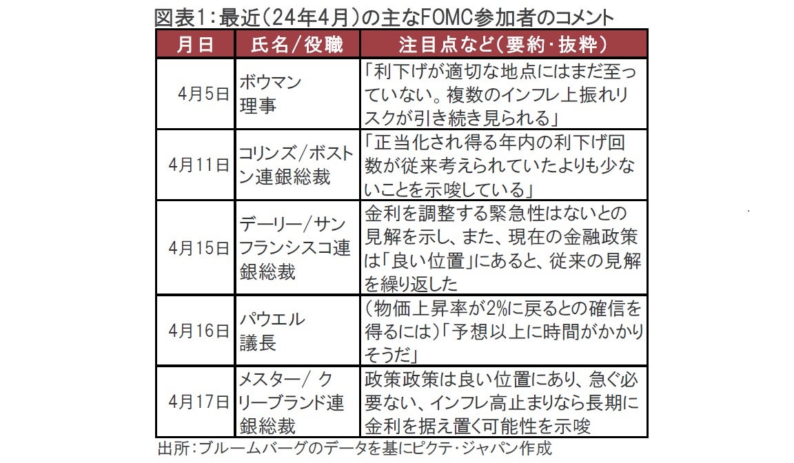ベージュブックは次回のFOMC(4月30日-5月1日開催)の検討資料の1つです。市場やFOMC参加者のインフレに対する懸念を高めたとみられる3月の米消費者物価指数(CPI、10日発表)前の情報をもとにベージュブックが作成されていることを踏まえれば、ベージュブックのトーンがややハト派(金融緩和を選好)的で、最近のFOMC参加者のタカ派(金融引き締めを選好)発言(図表1参照)と違いがある点はある程度説明されるでしょう。