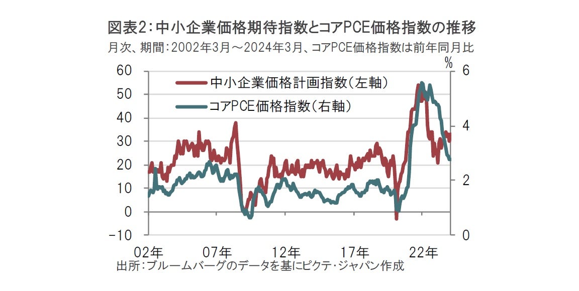 米国企業の価格設定とインフレ率の関係については、全米自営業者連盟(NFIB)が発表する中小企業価格計画指数(今後3ヵ月内に価格を「引き上げる」と「引き下げる」の差を指数化)が注目されます。同指数は3月が33と多くの中小企業が値上げを計画しています。同指数はFRBが注目するインフレ指標である個人消費支出(PCE)価格指数から変動の大きい項目を除いたコアPCE価格指数と連動する傾向が見られるため、筆者はその動きに注目していました(図表2参照)。