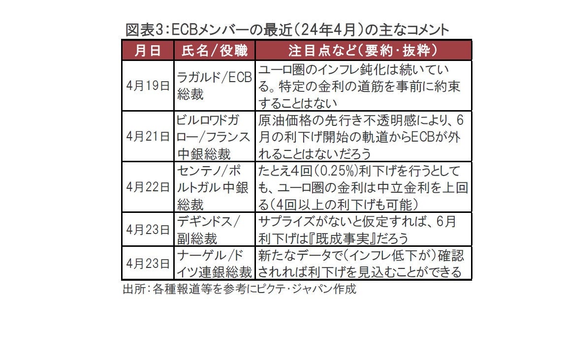 このように、ドイツの底上げによるユーロ圏の景気回復シナリオは、あくまでECBの利下げが前提条件です。そこで最近のECBメンバーの主な発言を振り返ります(図表3参照)。ラガルド総裁は過去の教訓を踏まえてなのか、具体的な利下げの開始時期などに言及していませんが、利下げの要件は整いつつあると述べている印象です。他のメンバーは概ね、6月の利下げ開始を意識させる発言内容と見られます。金融緩和に反対することが多いタカ派(金融引き締めを選好)のドイツ連銀(中銀)総裁も、ドイツの景気を考えてか、利下げ開始に反対ではないようです。