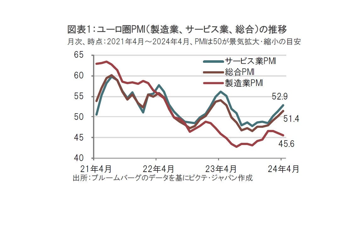 米S&Pグローバルが4月23日に発表した4月のユーロ圏の購買担当者景気指数(PMI、速報値)は総合が51.4と、市場予想の50.7、前月の50.3を上回りました(図表1参照)。内訳は製造業PMIが45.6と前月の46.1を下回った一方で、サービス業PMIは52.9と、前月の51.5を大幅に上回り、消費などを含むサービス業が総合PMIを押し上げました。なお、4月のPMIの調査期間は4月11~19日で、イランがイスラエル本土を初めて直接攻撃した時期に概ね該当します。