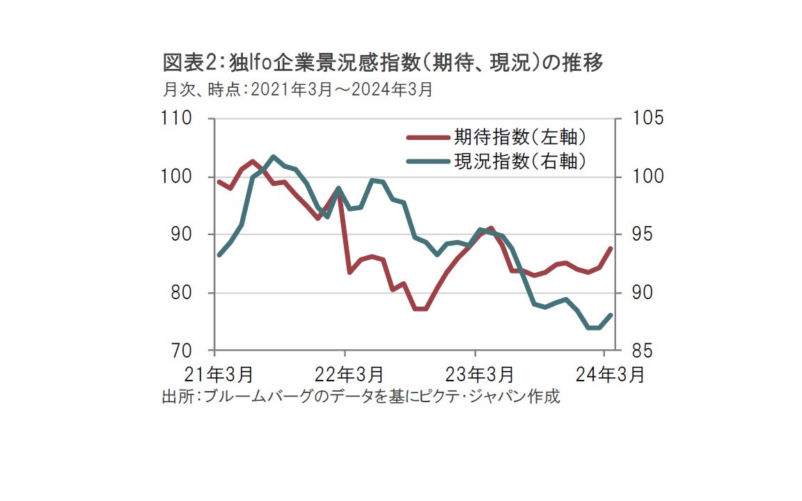 ドイツのIfo経済研究所が発表する企業景況感指数でドイツの景況感を足元(現況指数)と、先行き(期待指数)で比べると、現況指数の回復は鈍い一方で、期待指数に回復の兆しが見られました(図表2参照)。欧州中央銀行(ECB)の利下げ開始の期待が高まる中、借り入れコストは低下するとの見通しが期待指数を改善(上昇)させた可能性があります。