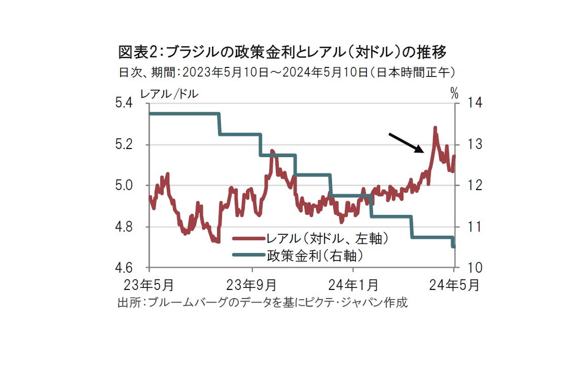 ただし不安材料もあります。ルラ政権は先月15日、プライマリーバランス目標(25年はGDP比で0.5%の黒字、26年は同1%の黒字の見通しを共に)を0.25%に引き下げ財政黒字化目標達成時期が後ずれしました。この発表などを受けレアルは急落しました(図表2矢印参照)。プライマリーバランス目標の0.25%はあらかじめ定められた許容範囲内であることなどから、その後市場は落ち着きましたが、不信感は残っていると見られます。米国の利下げ開始時期見通しが後ずれし、レアル安圧力が強いことからブラジル中銀も5月7-8日の金融政策決定会合では利下げ幅を縮小しました。為替の感応度が高い時期の財政目標変更に違和感もあり、ルラ政権の今後の財政運営には注視が必要です。