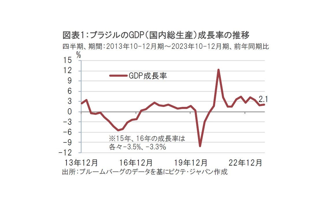 ①については、ブラジルの格下げが相次いだ15年~16年のマイナス成長と反対の状況です。ブラジルの22年、23年の年次のGDP(国内総生産)成長率は各々3.0%、2.9%でした。一方、15年~16年はマイナス成長が続きました。その主な要因はレアル安などを背景にインフレ率が上昇したために消費が冷え込んだこと、政治スキャンダルが相次いだこと、中国への輸出減少などです。