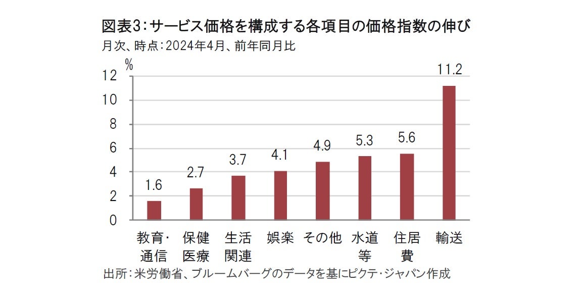 サービス価格を構成する主な項目について、4月の伸びを見ると(図表3参照)、輸送が11.2%上昇と突出し、主に賃料や帰属家賃(自宅を家賃換算した賃料)で構成される住居費が続きます。サービス価格は4月の伸びは5.3%であったことから、輸送と住居費が全体の伸びを上回っていたことになります。