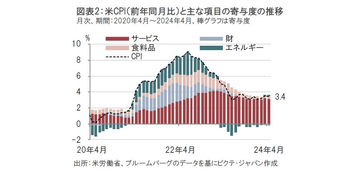 4月の米CPIは前年同月比で3.4%上昇しました。この物価の伸びの構成をエネルギー、食料品、財、及びサービスの各項目に分類し、各項目の寄与度でみると、物価の伸びはほぼサービス価格で説明されています(図表2参照)。