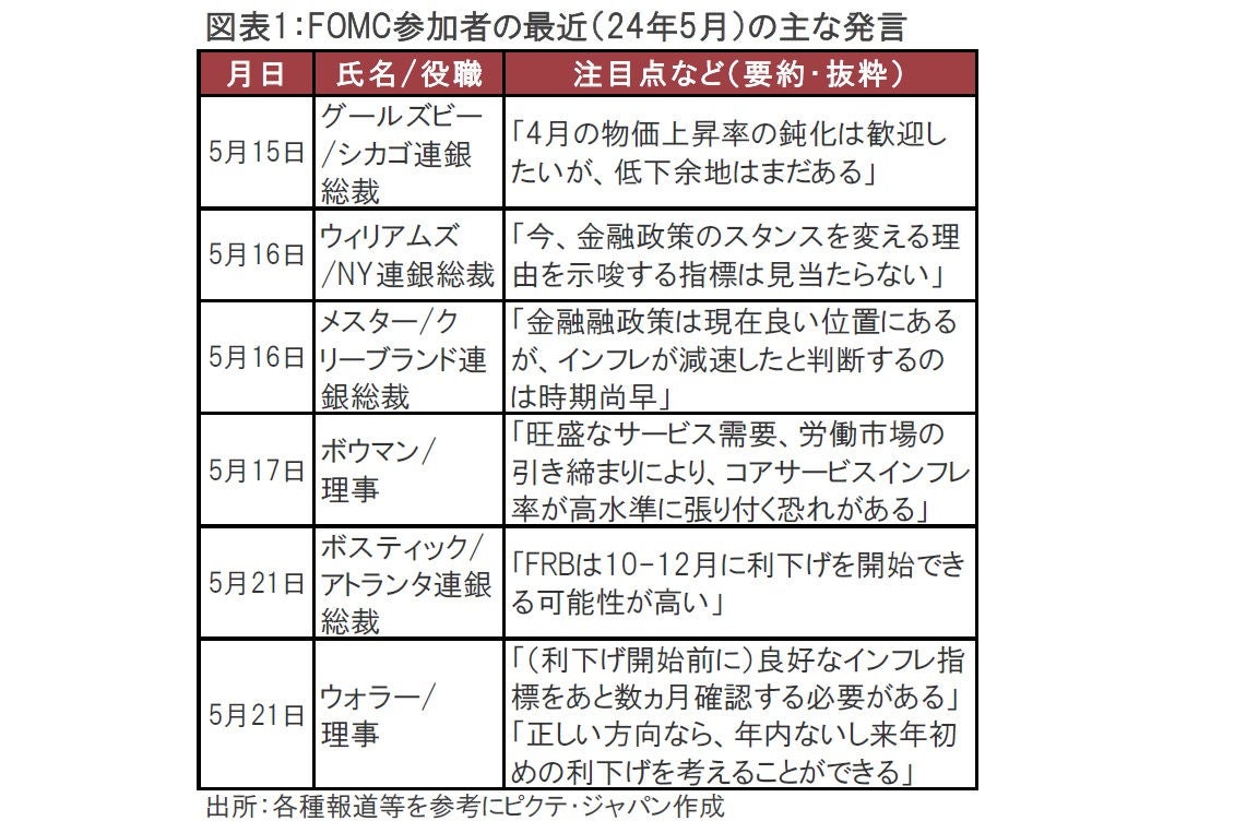 FOMC参加者の最近の発言を振り返ると、議事要旨同様、インフレ再加速への警戒感がうかがえます。ハト派的な発言をする傾向があるシカゴ連銀のグールズビー総裁やニューヨーク(NY)連銀のウィリアムズ総裁であっても、4月のCPIの減速だけでは利下げ開始には不十分と述べています。