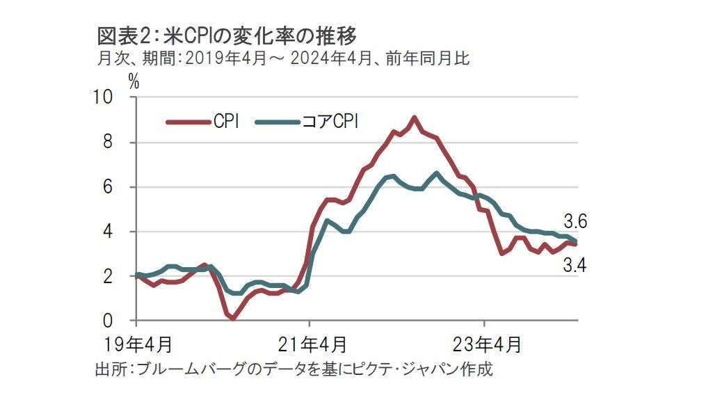 議事要旨の内容は最近のFOMC参加者の発言と概ね整合的で根強いインフレへの警戒感が見られます(図表1参照)。ただ、FOMC前に公表された多くのデータがインフレ再加速の懸念を示していたのに対し、FOMC後に発表された4月の米消費者物価指数(CPI、図表2参照)等はインフレ鈍化を示しました。そのため、議事要旨と最近のFOMC参加者の発言の間に微妙な違いも見られます。