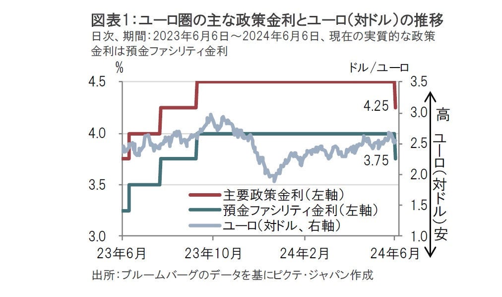 欧州中央銀行(ECB)は6月6日に開いた理事会で、市場予想通り政策金利を0.25%引き下げ、預金ファシリティ金利を3.75%とすることなどを決定しました(図表1参照)。利下げは19年9月以来です。利下げを決定した理由として、声明文では、インフレ率の減速傾向に確信度合いを深めたことを挙げています。