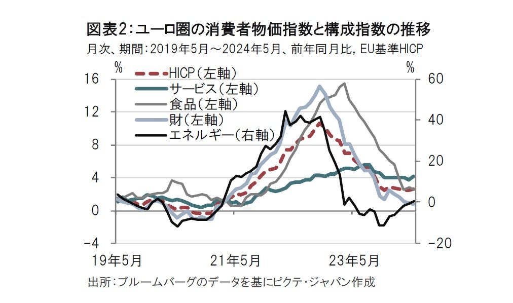まず、利下げ開始を決めた主な要因はユーロ圏のインフレ率(消費者物価指数、HICP)が減速傾向なことです(図表2参照)。5月のHICPは前年同月比2.6%上昇と、ピーク時(22年10月、10.6%上昇)のインフレ率を大幅に下回っています。