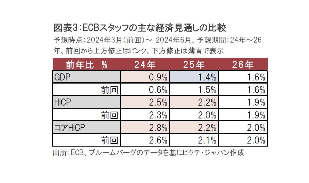 今回の理事会ではECBスタッフの経済見通しが発表されました(図表3参照)。24年のインフレ予測 (HICP)は、変動の大きい項目を除いたコアHICPも含め前回から上方修正されました。利下げを決定した理事会でインフレ予測が上方修正では整合的でない印象を受けますが、最近発表されたデータの上振れを調整する必要があったため、市場も上振れを予想していたようです。むしろ、ECBのラガルド総裁が注目する中期(26年)の予測が据え置かれたことから、時期は不確実ながら、追加利下げ路線の維持が想定されます。