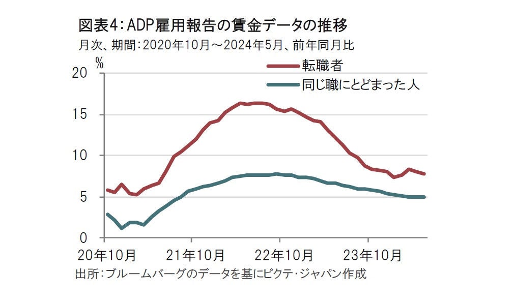 5月の米雇用統計は平均時給の伸びが前月を上回った点などから強いとしても、6月月初に発表された他の米労働市場関連の統計と方向性が違う点には注意が必要です。例えば、米民間雇用サービス会社ADPが6月5日に発表した5月の全米雇用報告で、転職した人の賃金は前年同月比7.8%上昇と、2ヵ月連続で伸びが鈍化し、同じ職にとどまった人の賃金は5.0%上昇と、21年以来の低い伸びに並びました(図表4参照)。また、米労働省が4日発表した4月の雇用動態調査(JOLTS)では、非農業部門の求人件数(速報値)が805.9万件と、前月を大幅に下回り、労働市場の過熱感が和らいでいることが示されました。