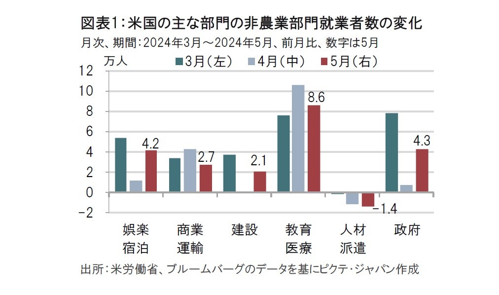 米労働省が6月7日に発表した5月の雇用統計で、非農業部門の就業者数は前月から27.2万人増と、市場予想の18万人増、前月16.5万人増を大幅に上回りました。就業者数の伸びを部門別に見ると、娯楽・宿泊、建設、政府など4月に伸びが縮小した部門において、5月に伸びの再拡大がみられました(図表1参照)。