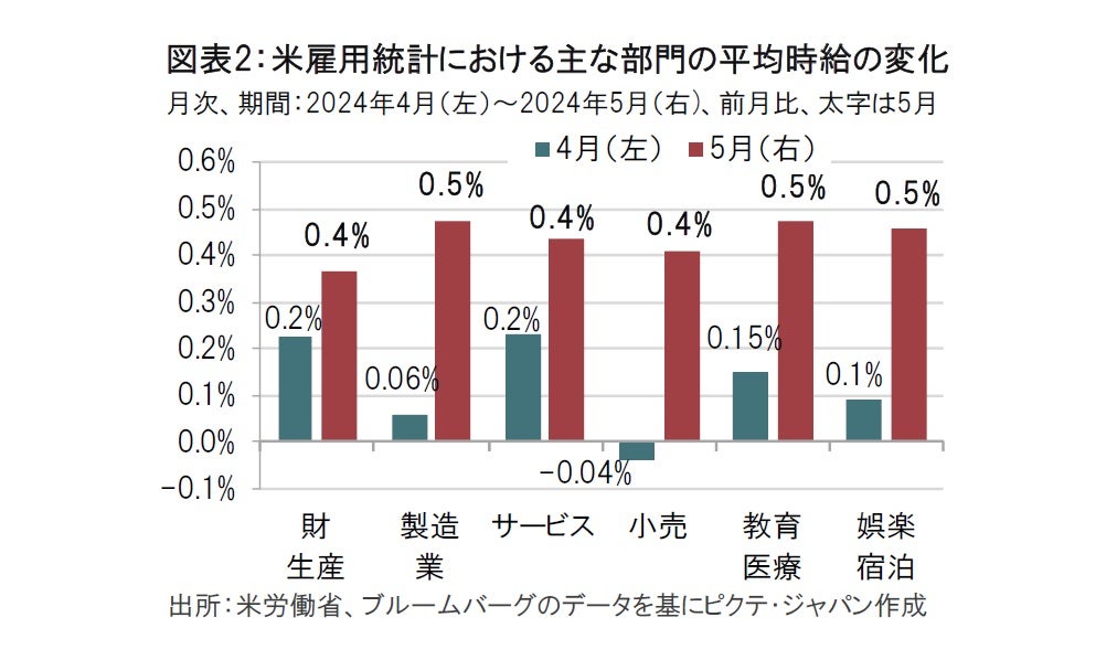 1点目は非農業部門の就業者数の前月からの伸びです。2点目は平均時給の伸びです。特に平均時給を部門別に見ると、特定の部門に偏っての上昇というより、幅広い部門に伸びが見られ、力強さがうかがえます(図表2参照)。