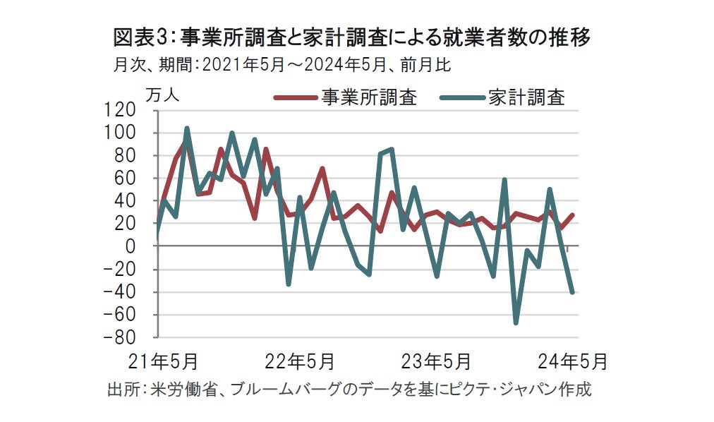なお、米雇用統計では就業者数について事業所調査と家計調査の2通りで算出しています。同じ就業者数でも事業所調査と家計調査では調査対象が異なるためデータは異なります(図表3参照)。雇用統計の報道で目にする非農業部門の就業者数は事業所調査のデータです。一方、失業率の算出には家計調査の就業者数が分母の一部に使われます。5月は2つの調査の差が目立ち、家計調査の就業者数は前月比40.8万人減となった一方、事業所調査は27.2万人増でした。複数の職場で働いている人や、家族経営の就業者の数え方などに違いがあり、両調査対象の違いが表れたに過ぎないという面はありますが、どちらが実態に近いのかという議論は、失業率などにも影響することから、今後も続けられそうです。