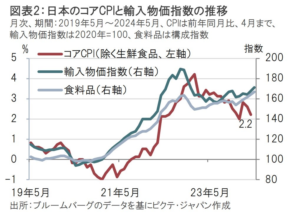 インフレはより重要でしょう。日銀が注目するコア消費者物価指数(CPI、除く生鮮食品)は4月分が前年同月比2.2%上昇と鈍化傾向に見えますが(図表2参照)、21日発表予定の5月分は電気料金の影響で2.6%の上昇が市場で予想さるなど押し上げ要因が複数あるからです。また、輸入物価指数も足元じり高傾向です。仮に更なる円安進行となれば、輸入物価指数の上昇も想定されます。