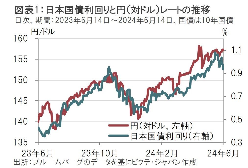 植田総裁は会合後の記者会見で減額は「相応の規模になる」との見解を示しました。今回の会合では国債買い入れ額の減額方針が決められただけにとどまったこともあり、市場では円安、国債利回り低下が一時的にみられました。しかし植田総裁の会見後に、市場は概ね落ち着きを取り戻しました(図表1参照)。