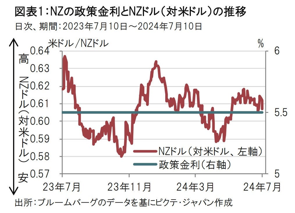 ニュージーランド(NZ)準備銀行(中央銀行)は7月10日、市場予想通り政策金利を5.5%で据え置くことを決定しました。据え置きは23年7月以降、8会合連続となります(図表1参照)。