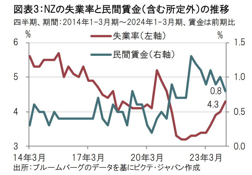 NZの雇用市場のデータを確認すると、NZの賃金の伸びは概ね21年の水準にまで鈍化しています(図表3参照)。雇用市場のバロメータである失業率をみると、NZの失業率はコロナ禍の混乱が落ち着いたことで、急速に低下し、過去最低水準で推移していましたが、足元はじりじりと上昇傾向です。1-3月期の失業率は4.3%と、コロナ禍前の水準となっています。