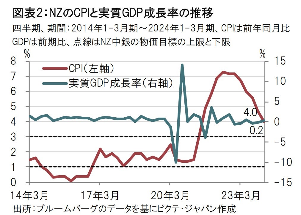 最初に、インフレ見通しの改善が挙げられます。NZの消費者物価指数(CPI)は21年から足元まで前年同月比が3%を上回る水準で推移しています(図表2参照)。一方で、実質GDP(国内総生産)成長率は、昨年後半に前期比が2四半期連続でマイナス成長を記録しました。今年1-3月期は前期比0.2%増とプラス成長に転じたものの、在庫投資が押し上げ要因と力強さに欠ける内容でした。景気が弱い中で引き締めを続けたことで、インフレ率が物価目標上限へ到達する時期を24年10-12月期としていましたが、今回の会合で「24年後半」に到達すると、予想時期を前倒ししました。