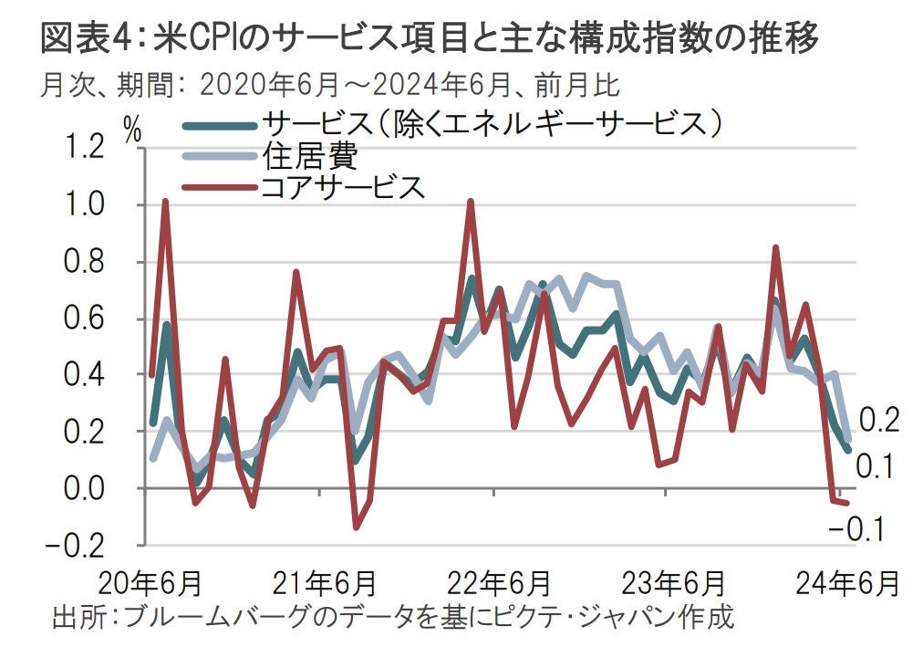 6月の米CPIで注目すべきはサービス価格の鈍化でしょう。サービス価格(除くエネルギーサービス)は前期比が0.1%上昇と、減速が見られた5月の0.2%上昇をさらに下回りました(図表4参照)。