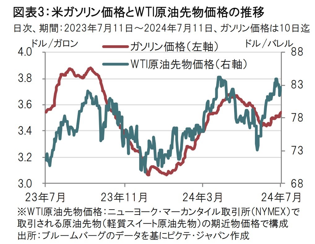 エネルギーは前月比2.0%下落でした。5月も同じく2.0%下落でした。内訳をみると下落の大半はガソリン価格の下落によるもので、電気とガスの料金を反映するエネルギーサービスは均してみると落ち着いていました。図表3でガソリン価格(全米平均のレギュラーガソリン価格)を見ると、5月、6月と前月比で下落しています。CPIのガソリン項目も同様の動きでした。ただし、ガソリン価格に先行する傾向がある原油価格は6月月初から上昇に転じており、今後のガソリン価格への影響に注目しています(図表3参照)。