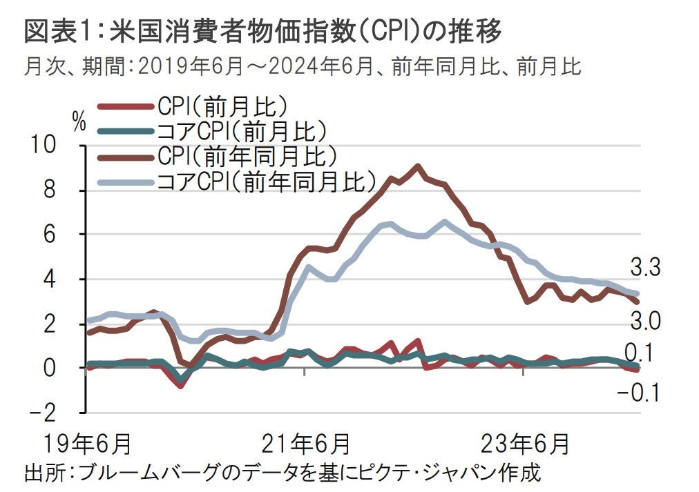 米労働省が発表した6月の消費者物価指数(CPI)は前月比で0.1%下落するなど、物価の減速傾向が明確となりました。ガソリン価格の低下によるエネルギー価格下落と、サービス価格が主な押し下げ要因です。サービス価格のうち高水準で推移してきた住居費に待望の鈍化の兆しが見られました。今回の物価鈍化の持続性について確認は必要ですが、利下げ開始を支持する証拠が増えつつあるようです。