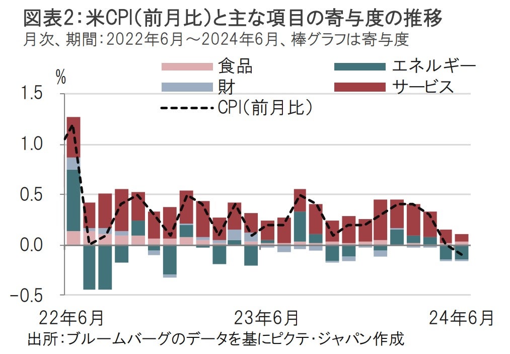 6月の米CPIで前月比は物価の下落が示されました。これをエネルギー、食料品、財、及びサービスの各項目に分類し、項目別に寄与度で見ると、6月の主な下押し要因はエネルギーのマイナス寄与と、サービスの寄与度の低下です(図表2参照)。各項目の注目点、今後のポイントは次の通りです。