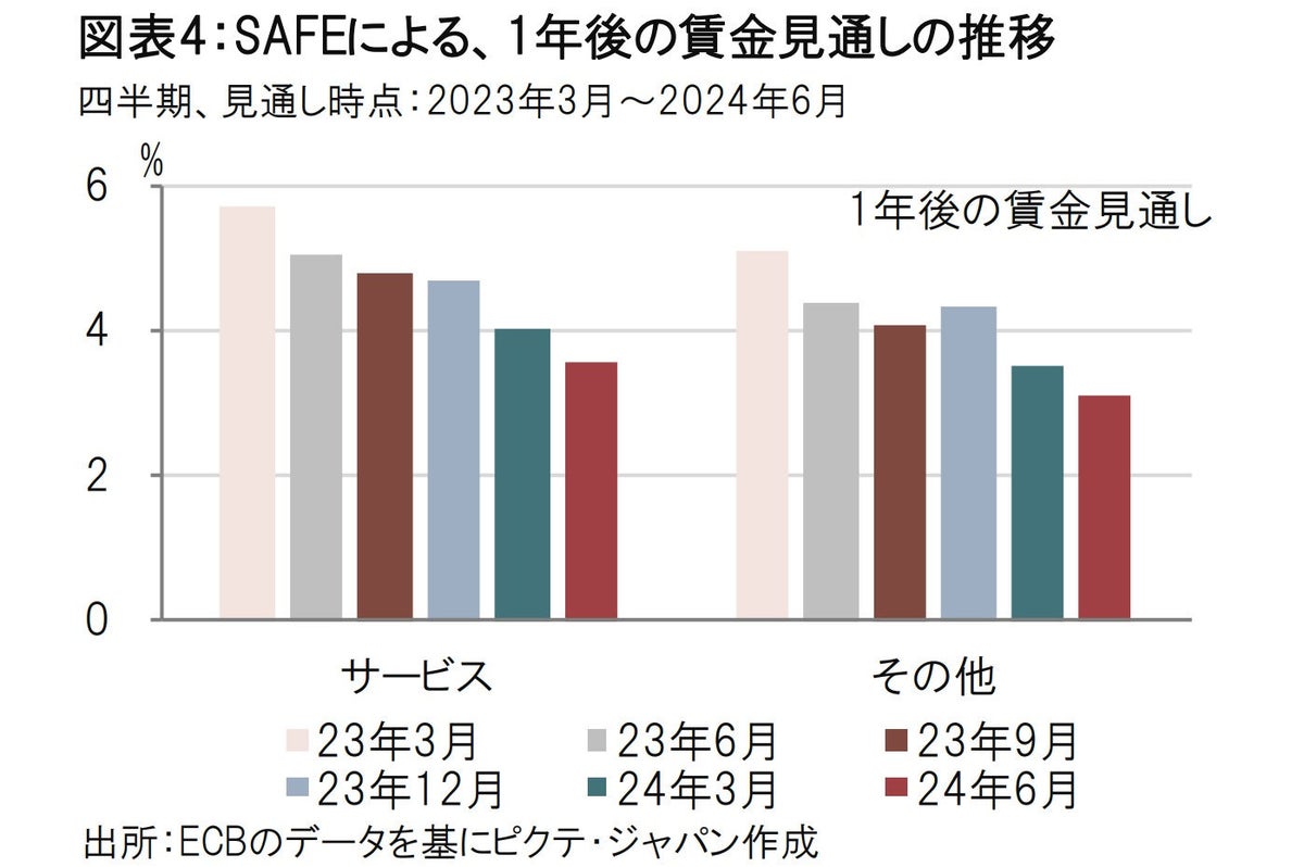 別のデータとして企業への聞き取り調査(SAFE)で今後の価格設定(図表3参照)や賃金(図表4参照)の見通しを把握しているようです。先日発表されたSAFEで企業の価格設定見通しを「サービス企業」と「その他企業」の2つのグループに分けて見ると、次の点が明らかです。