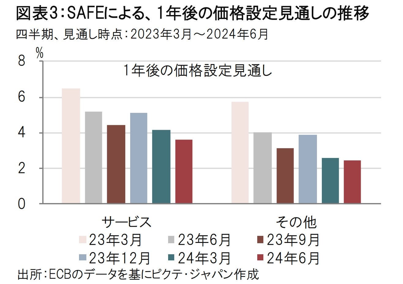 まず、価格設定見通しは緩やかに低下傾向です。23年3月時点では1年後の価格設定をどちらの企業グループも6%前後としていましたが足元に近づくにつれ見通しを引き下げているからです。