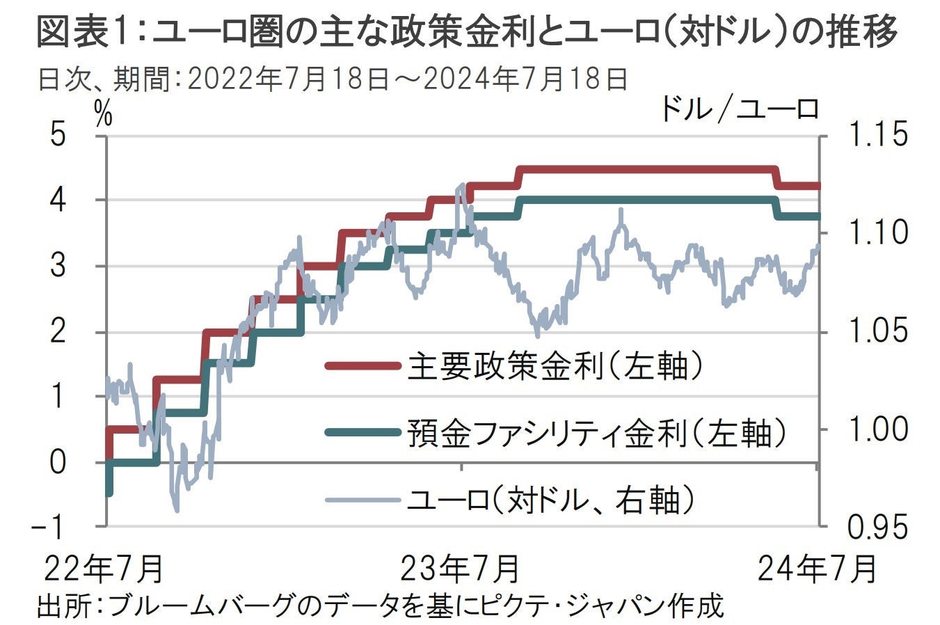 欧州中央銀行(ECB)は7月18日に政策理事会の結果を公表し、市場予想通り政策金利を据え置くことを決定しました(図表1参照)。ECBは前回6月の理事会で利下げを開始したものの、今回は連続の利下げを見送ることが適切と判断しました。