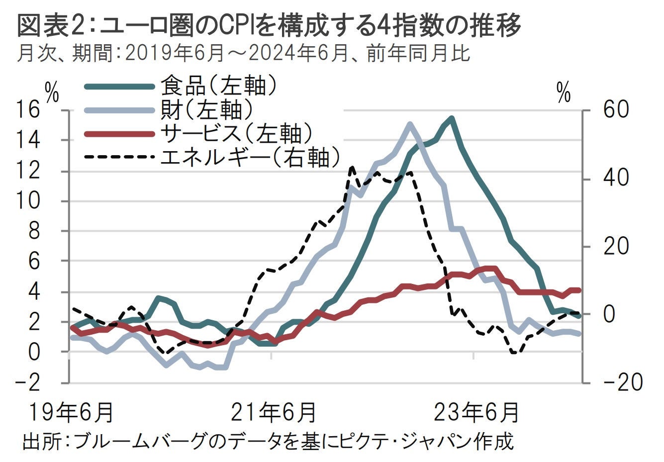 ECBは経済情勢判断について、ユーロ圏のインフレ率や賃金は6月に公表した見通しに沿う動きだったと評価しています。一方、サービス価格の高止まりについては声明文や、ラガルド総裁の会見で懸念が表明されました。このことは、ユーロ圏の消費者物価指数(CPI、欧州連合(EU)基準、HICPとも呼ばれる)に示されています(図表2参照)。ユーロ圏CPIを4つの構成指数に分類(エネルギー、食品、財、サービス)すると、サービスを除いた他の3指数は6月のユーロ圏CPI全体の伸びである前年同月比2.5%を下回りました。また、それら3指数の前年同月比の伸びは、5月の伸びを下回り鈍化がみられます。一方、サービス指数の伸びは6月が4.1%と全体の伸びを上回ったうえ、5月と伸びは変わらず高止まりとなっています。6月の利下げ開始にはECB内部で慎重論が残る中での利下げでしたが、サービス価格を見ると、7月の据え置きは当然の決定のようにも思われます。