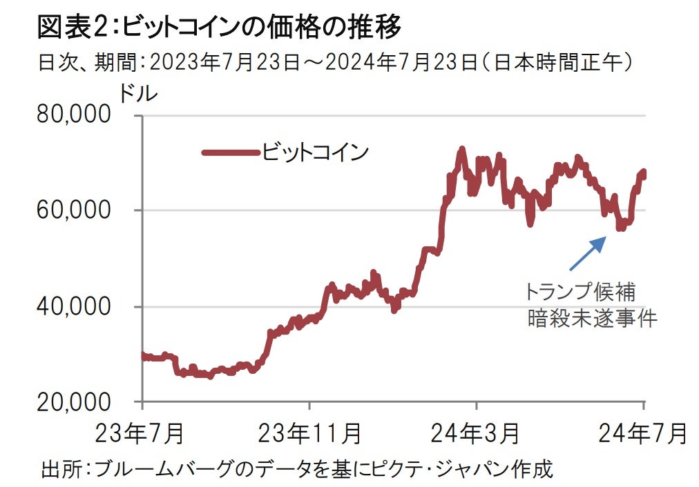 これらビットコイン市場特有のイベントの影響が弱まる一方で、ビットコイン市場は米大統領選挙も変動要因となりました。トランプ前大統領が暗号資産市場の規制緩和を進めるとの期待が高まったからです。選挙戦でトランプ候補が有利との観測が高まるとビットコインも上昇する傾向が見られるようになりました。足元のビットコインの反発は、トランプ暗殺未遂事件後に起きたことにその点が表れています。