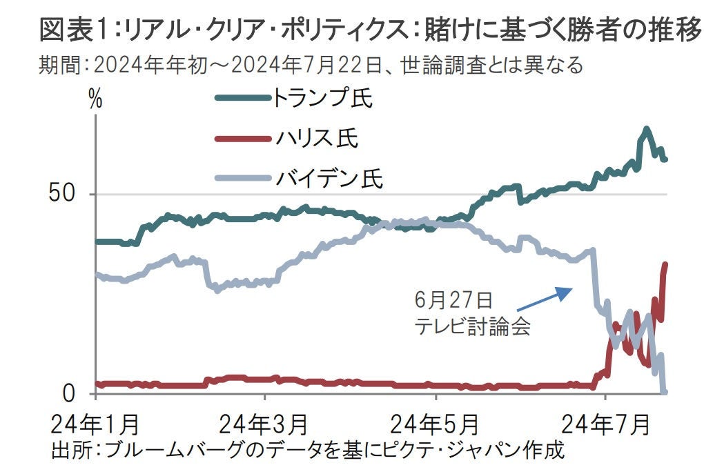 図表1は誰を支持するかという「世論調査」ではなく、誰が勝つかの「賭け」に基づいた調査です。縦軸は各候補が勝つ可能性とイメージできますが、ここでは横軸で変化の時点に注目します。