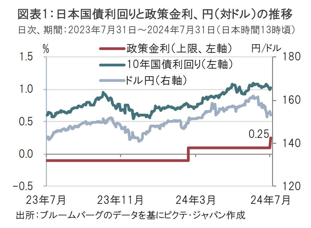 追加利上げを決めた一方、買い入れ減額計画を発表した直後の市場の反応を見ると円(対ドル)は1ドル=151円60銭台まで急騰した後、153円後半まで反落、その後発表前の水準近辺に戻るなど比較的落ち着いていました(図表1参照)。
