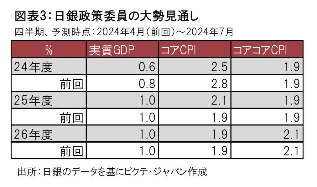 今回の追加利上げは、金融政策の「正常化」と過小評価されたことも、市場の当初の反応が小さかった原因かもしれません。今回発表された「経済・物価情勢の展望」(展望レポート)によれば、物価見通しが悪化(上昇)して利上げを決定したわけではなさそうです(図表3参照)。また、GDP(国内総生産)成長率は24年度が0.6%に下方修正された一方で、25年度、26年度は据え置かれており、経済成長の点では利上げを断続的に行う環境とは考えにくいように思われます。