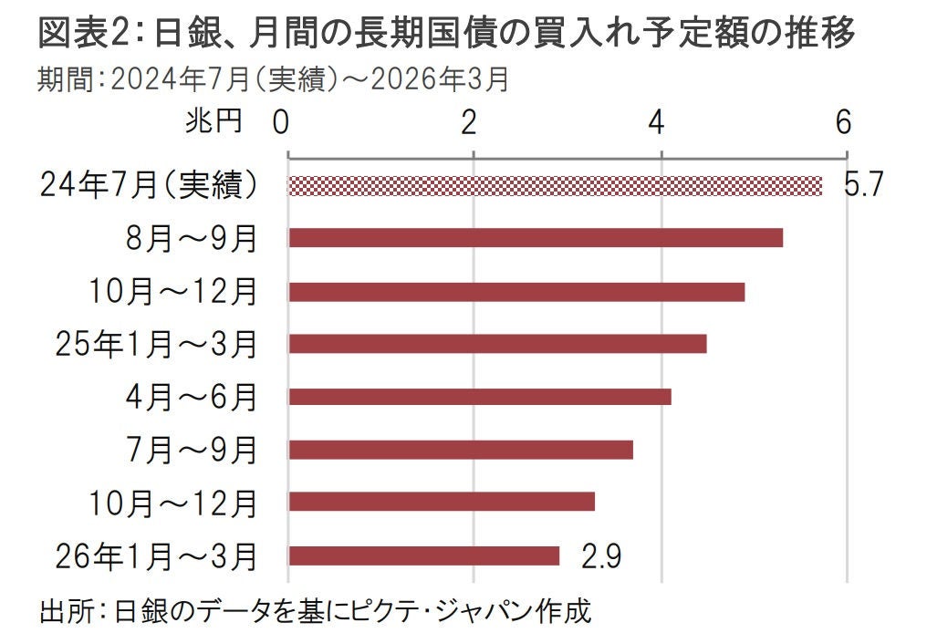 その理由は織り込みが進んでいたためとみられます(図表2参照)。国債買入れ減額は7月の実績(5.7兆円程度)から毎四半期4000億円程度ずつ減額し、26年1月~3月には約2.9兆円にまで減らすとしています。日銀は7月9日~10日にかけ債券市場参加者会合を開催し、その議事要旨も公表しています。そこから浮かび上がるコンセンサスと、7月会合で発表された結果に大差はなく、すんなり受け止めたものとみられます。